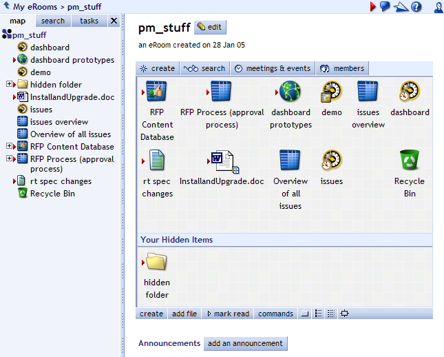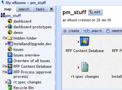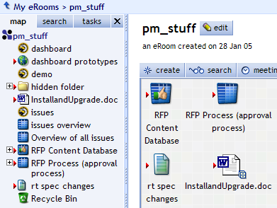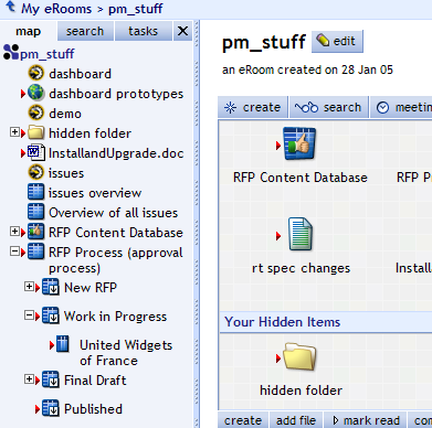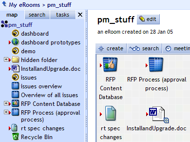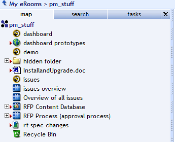 When you first open your eRoom, the page has a side panel called the map, which initially shows an expandable tree of all the items on the front page of your eRoom.